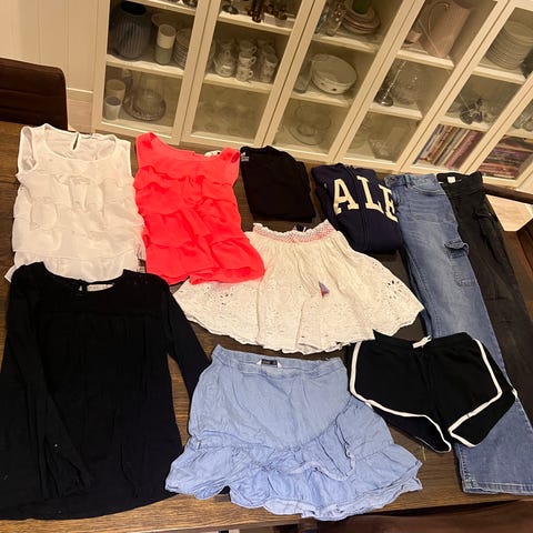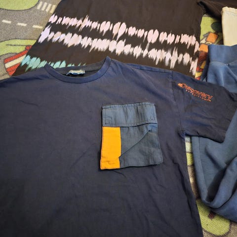 Klespakke som inneholder ulike typer klær som gensere, bukser, ull, shorts og t- skjorter. Selges samlet kr 300,-