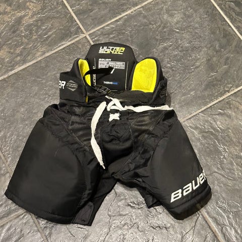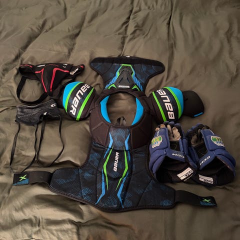 CCM ishockeybukse og hansker. Utstyr beregnet for ishockey, med beskyttende funksjoner for sporten. Størrelse 147-157