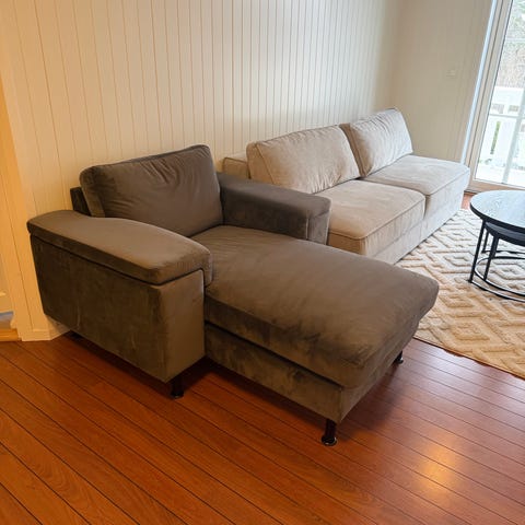 Noe slitasje på armlenene (2 små hull som er "lappet" på ene armlene) Ellers i bra stand.