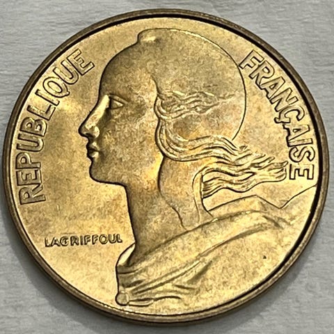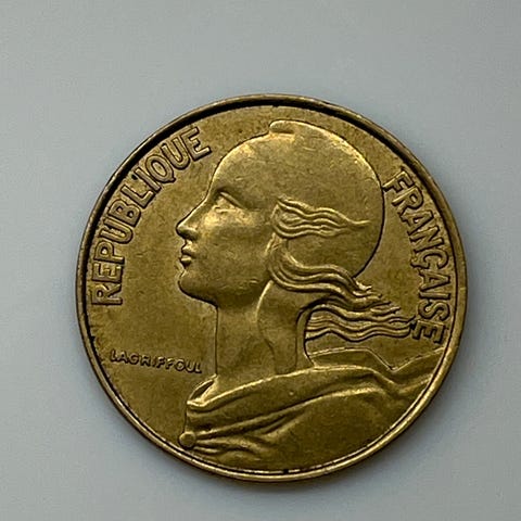 Mynt fra Frankrike 1976 med bilde av Hercules på forsiden og en krans på baksiden.