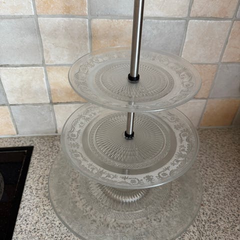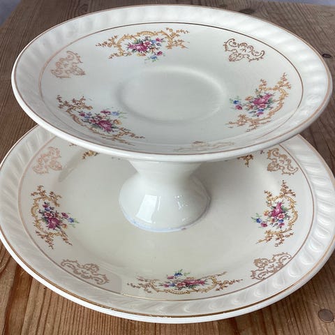 Nylaget etasjefat laget av 3 vintage asjetter. Stort hvitt fat nederst, en deilig romantisk blomstrete asjett i midten og klart glass på topp.