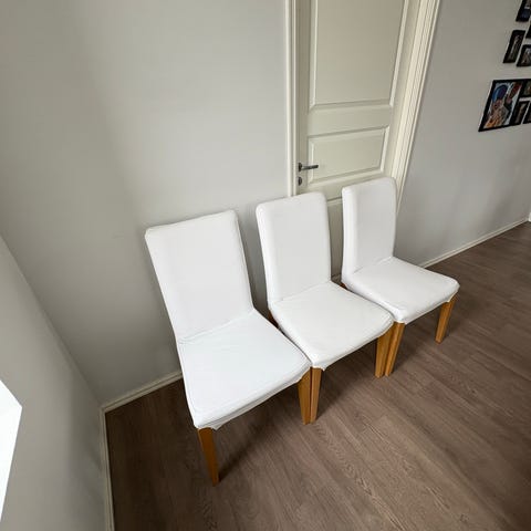 6 stk Henriksdal spisestuestoler fra IKEA selges helst samlet. Kr 100 pr stk. Hvitt trekk i kraftig bomull som kan tas av og vaskes. Noen av trekkene har små bruksmerker. Det går an å kjøpe nye trekk i ulike farger. Solid treverk i lakkert lyst tre (ask eller bøk?)