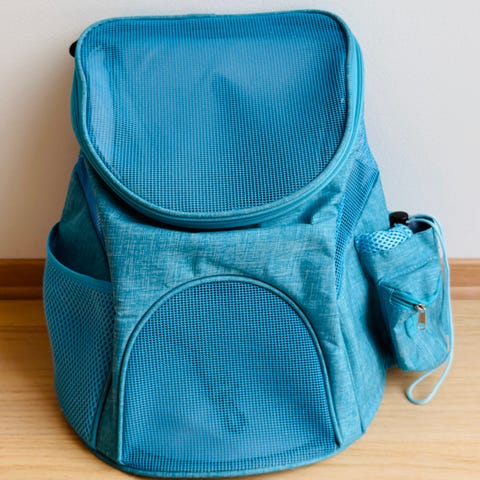 Ryggsekk i rosa stoff med gjennomsiktig boblevindu på fronten. Sekken har flere luftingshull og justerbare skulderstropper. Egnet for transport av små kjæledyr eller gjenstander som krever ventilasjon og synlighet.