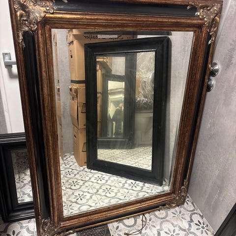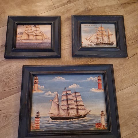 Nydelig tuftet «maleri» av skip i pen gullramme. Meget pent brukt.