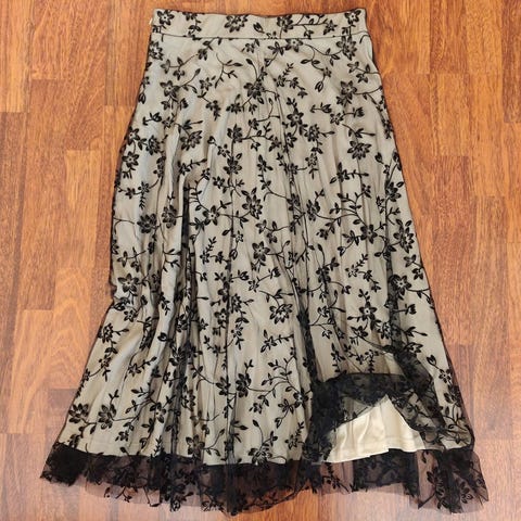 Langt kremhvit tyllskjørt merket str. L. Liten i størrelsen og som M. To lag med tyll og et underskjørt innerst. Blondestoff foran, bak og på siden. Elastisk strikk i livet som ikke blir så stramt når det strekkes. Bånd som kan knytes i midjen. Midje måler ca. 72-104 cm. Lengde ca. 83 cm. Lengde underskjørt ca. 75 cm. Brukt en gang og fremstår som ny.