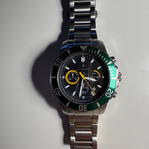 Pent brukt Nautica herreklokke med svart urskive og gul reim. Remmen er laget av gummi eller silikon, og klokken leveres med originalt etui og bruksanvisninger. 46mm, W/r 10 atm. Ny batteri.
