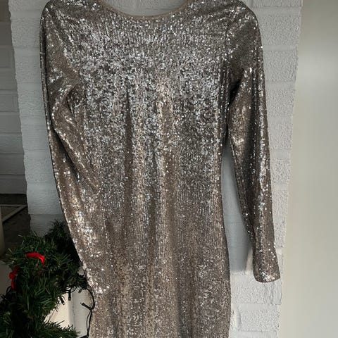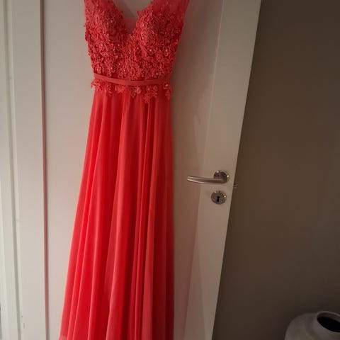 Vakker utringet selskapskjole med strass steiner. Kjøpt i Barcelona på en selskaps kjole butikk. Brukt 2 ganger i bryllup. Som ny. Selges da den bare henger i skapet og ikke kommer til å bli mer brukt