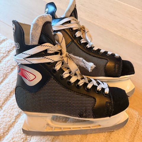 Story ishockeyskøyter for barn i størrelse 35. Skøytene er hvite med rosa detaljer og er laget for ishockey. De har justerbar lukking for god passform.