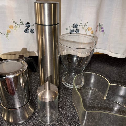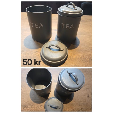 Te boks, kaffekrukke, serviettholder og 4 bakematter i silikon. Selges samlet 150,-