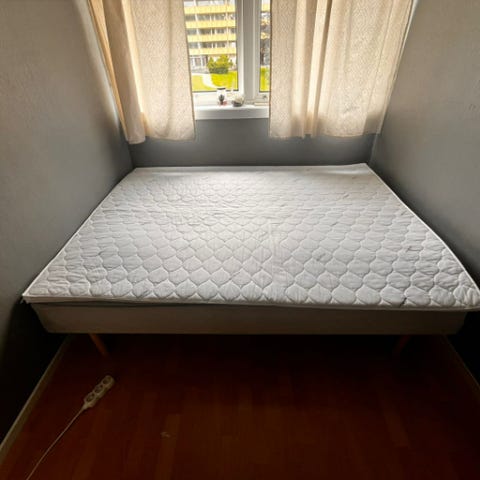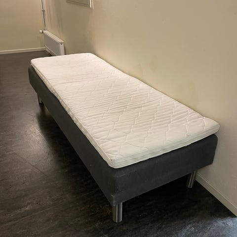Rammemadrass 80x200 cm med overmadrass. En planke brukt under, men synlig reparert.