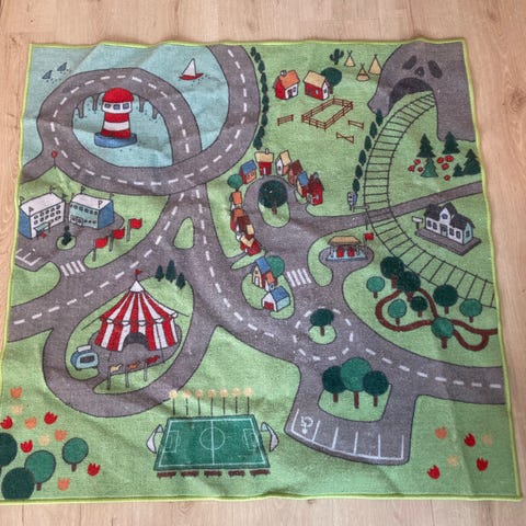 Bilteppe med motiv av by, veier, biler, telt og ulike bygninger. Passer til barnerom eller lekeområder. Fargerik og dekorativ med detaljer som fotballbane, karusell og båter.