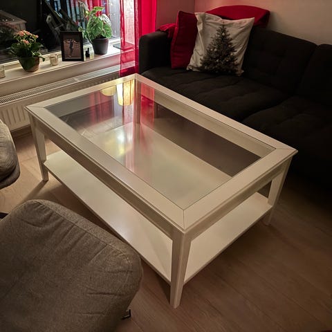 Bordet har et vakkert, minimalistisk utseende med hvit metallramme og glassplate. Perfekt som salongbord i stuen eller til og med som en TV bord eller sidebord i små leiligheter eller hybel.