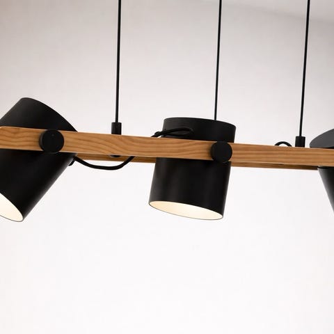 Flott taklampe/lysplanke i treverk med 5 stykker dimmbare pærer i forskjellige dimensjoner.