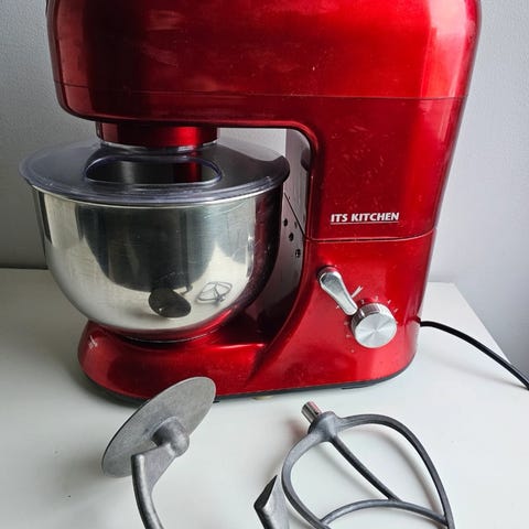 ITS Kitchen kjøkkenmaskin i rød farge med bolle i rustfritt stål. Maskinen er designet for kjøkkenbruk og har funksjoner tilpasset baking og matlaging. Følger bollevisp.