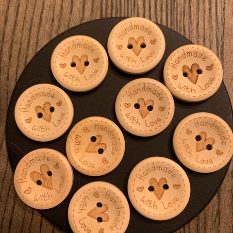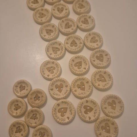 Knappene har hull for festing og kan brukes til å merke klær, tekstiler eller andre gjenstander.