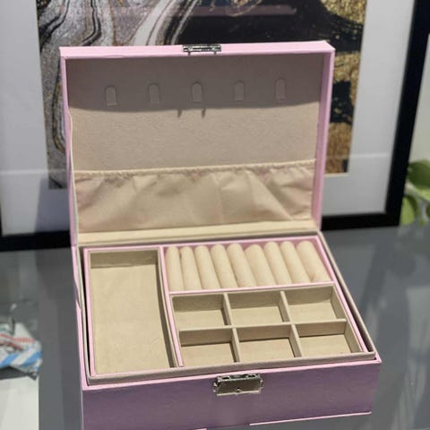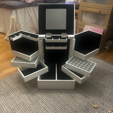 Helt nytt smykkeskrin i en fin hvit farge. Perfekt oppbevaring for alle smykker og annet! To skuffer og ett hovedrom. Nøkkel følger med. PU Skinn. Kan sendes for 69kr via vipps.