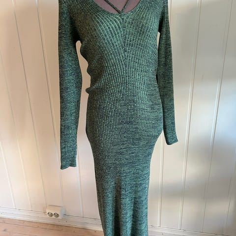 Grønn strikkekjole fra Lindex. Lengde: 97 cm. M. 60 % bomull, 40 % akryl. Ingen nupper.