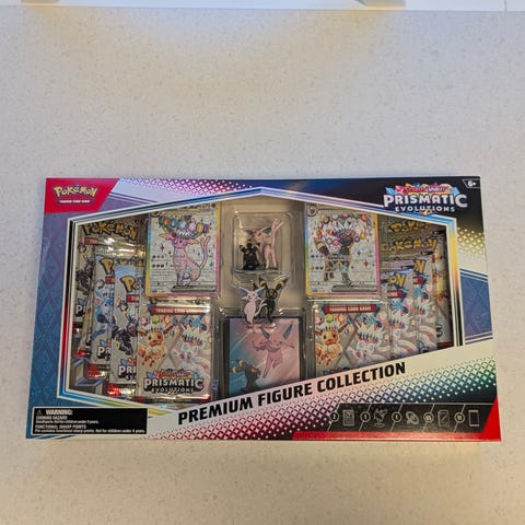 Pokémon Prismatic Star Premium samlekortsett inneholder et utvalg av samlekort og seks metallbokser med Pokémon-motiv. Settet inkluderer ulike kort som kan brukes til samling eller spill. Metallboksene har fargerike design med forskjellige Pokémon-figurer. Kortene og boksene er laget for samlere og spillere av Pokémon-kort.