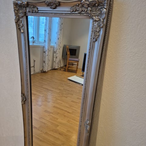 Speil med dekorativ gullramme i klassisk design. Rammen har detaljerte utskjæringer i hjørnene og langs kantene. Speilet er rektangulært og egnet for veggmontering i ulike rom.