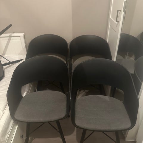 Vi selger seks stk. spisestoler med solid aluminiumsunderstell/ben, med stofftrekk i grovvevet mellomgrått/ melert farge. Noen år gamle, men pent behandlet av forsiktige pensjonister. Selges samlet. Stavanger, sendes ikke. Kr. 1000 samlet