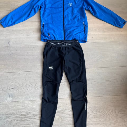 Bjørn Dæhlie treningsdress/langrennsdress for herre i størrelse M. Dressen består av jakke og bukse med fargekombinasjon i blått og hvitt.