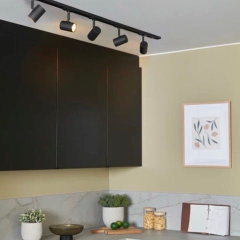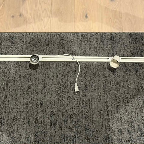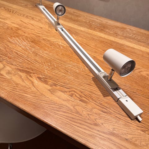 Pent brukt spotskinne 3 stk 1 meterslengder inkludert skjøtestykker og 8stk styrbare spot-pærer fra IKEA