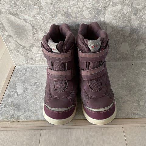 Viking barnesko i størrelse 33 for unisex. Skoene er svarte med hvite detaljer og har en robust konstruksjon som egner seg for aktiv bruk.