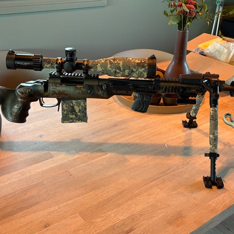 Remington 700 22-250 med nyere tykt fluta løp, gjenget for demper 18x1. Dier følger med.