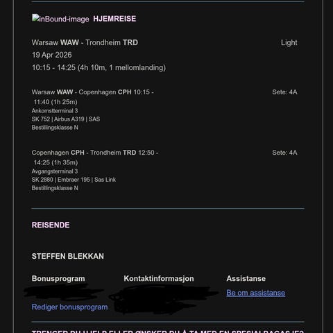 2 billetter tur og retur Trondheim-Stockholm torsdag 15e - mandag 19e