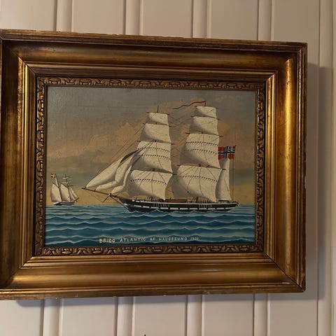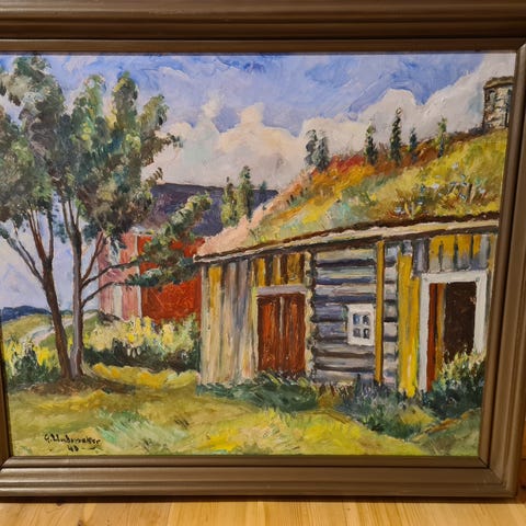 Malt av Reidar Lampe (1887-1964) i 1950. 72 x 63 cm. Motivet er fra Bergen, merket Skuteviken på baksiden. Hentes på Askøy, eller eventuelt Bergen på dagtid.