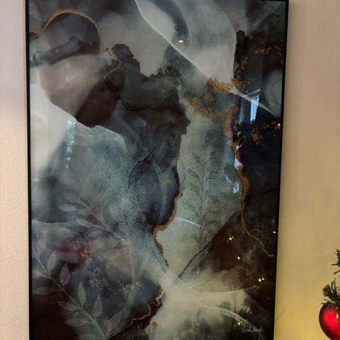 Abstrakt maleri med dominerende blå og grå farger, størrelse 55*46 cm. Maleriet har en teksturert overflate og innslag av guld detaljer. Helt nymalet bilde på lerret, blir signert. Beroligende harmoniske sensuelle farver på et lerret.