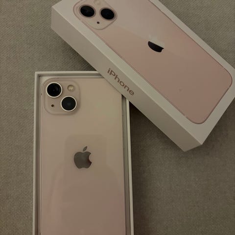 Apple iPhone 13 mobiltelefon med 128 GB lagringskapasitet i rosa farge. Telefonen ble kjøpt ny i 2023 og er fint brukt siden da, med skjermbeskytter og deksel. Ingen synlige bruksmerker på telefonen.