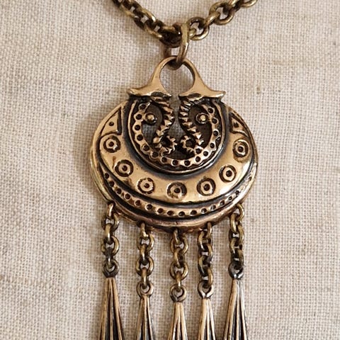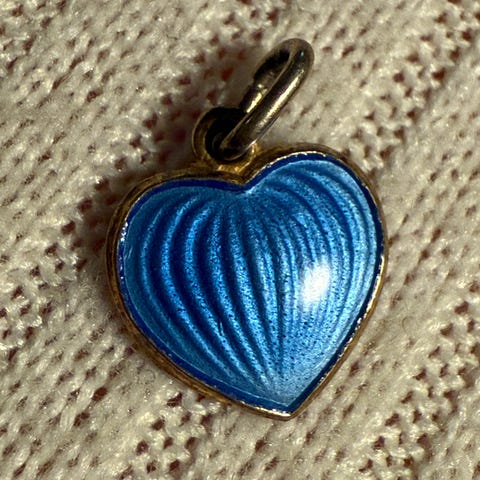 Gullforgylt halskjede med emaljert anheng med religiøs skrift på baksiden av anhenget. Sjeldent smykke. Halskjedet er stemplet 925 ved låsen. Kjedets lengde 37,5 cm. Hjerte anhenget måler 2x2 cm. Anhenget er også stemplet 925.