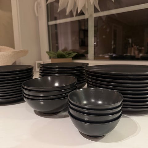 Tallerkener, 16stk 250kr: https://www.ikea.com/no/no/p/faergklar-tallerken-matt-mork-gra-00479713/