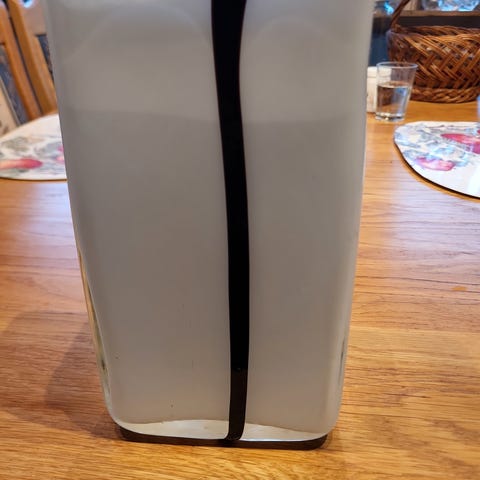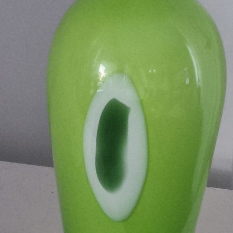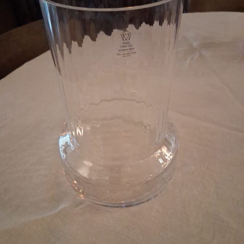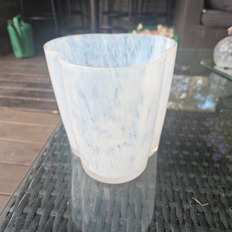 Meget pen håndlaget glassvase. Ukjent produsent. Diameter ca 12, høyde ca 9,5 cm.