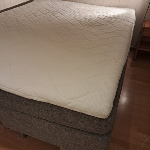 Selger en pent brukt rammeseng i størrelse 120x200 cm samt overmadrass 120x200 cm.