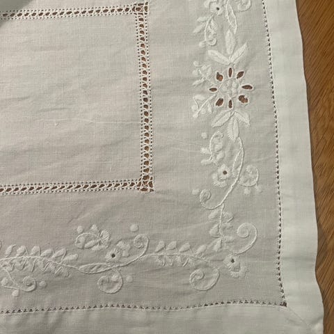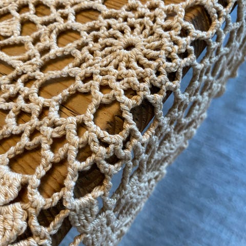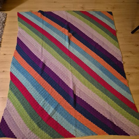 Heklet pledd i lys blå. Skjøt på vrangen ( se bilde) str 127-98 cm.