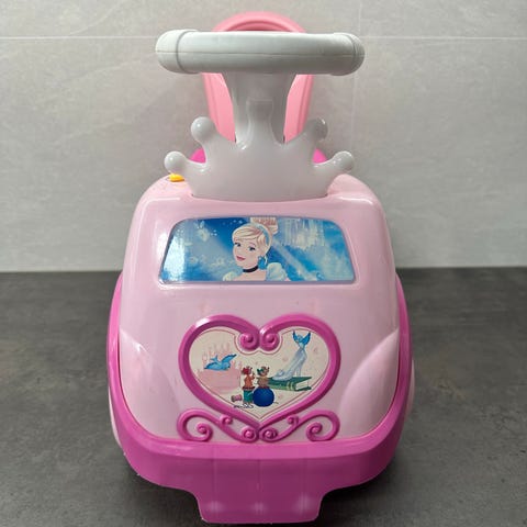 Disney prinsesse gåbil for barn i rosa. Gåbilen har et ratt og er dekorert med bilder av Disney-prinsesser. Den er designet for små barn og har fire hjul for stabilitet.