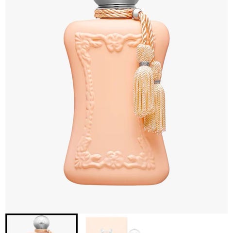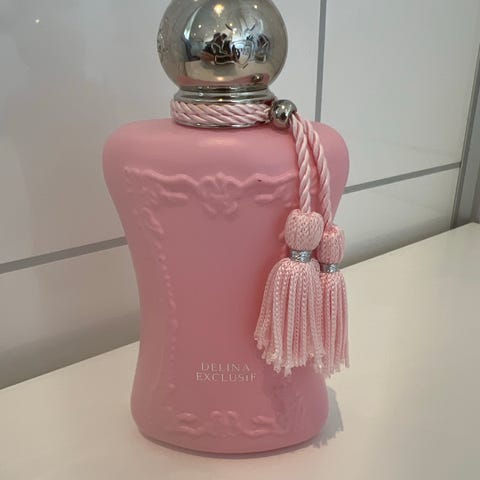 Parfums de Marly Delina parfyme i 30 ml størrelse. Flaska er rosa med dekorative detaljer og en sølvfarget kork. Produktet er beregnet for personlig bruk.