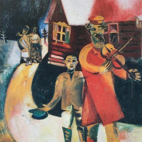 Maleri som viser en kvinne sett bakfra med langt, mørkt hår og en fargerik kjole med mønster i røde, oransje og brune toner. Bildet er innrammet med en lys passepartout.