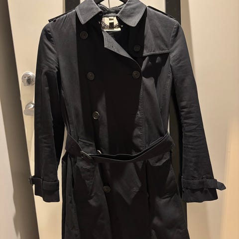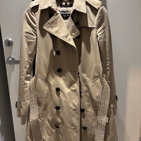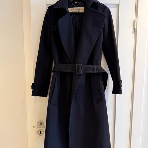 Kåpen har et klassisk design med dobbelspent knappelukking og belte i livet. Innsiden av kåpen har Burberrys karakteristiske rutemønster.