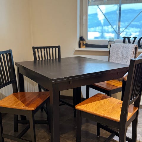 Brukt, noe bruksmerker, 105cm bordplate, hvit. Følger med 3 stoler. Må hentes og bæres ut selv.