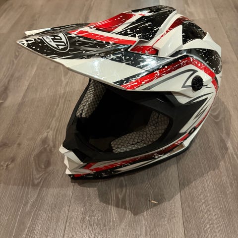 IXS Offroad hjelm str 57-58 cm i svart og hvitt design. Hjelmen har en toppskygge foran og lufting og er egnet for bruk i terrengkjøring og lignende aktiviteter. Hjelmen har ikke vært med i noe velt, er lite brukt og i god stand. Følger med hjelmtrekk og gratis briller. Brillene har en ripe( se bilde), men kan fint brukes. Hentes på Øren i Drammen eller sendes for kjøpers regning.