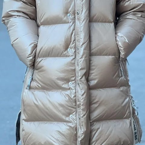 Veldig fin dun jakke med en hette som sitter på hodet.