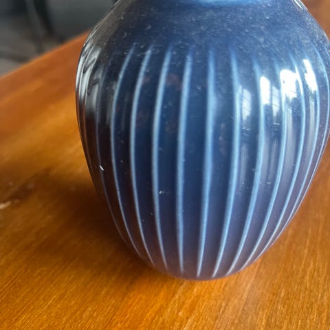 Superfin blå Kähler vase fra Hammershøi serien, designet av Hans-Christian Bauer. Høyde på ca 11cm og diameter på ca 9cm. Den er nesten ikke blitt brukt så den har ingen bruksmerker. Nypris på disse ligger på rundt 269kr.