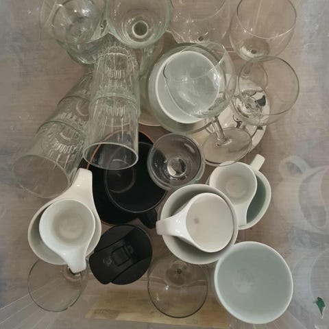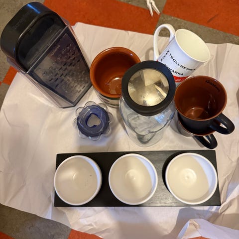 Diverse kopper, glass, skåler og kjøkkentilbehør gis bort. Kom og ta det du vil, men ting som hører sammen må hentes samlet. Tar du med ett vinglass må du også ta med tilhørende glass.