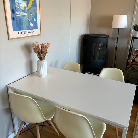 Spisebord fra IKEA (modell Ypperlig) selges med 6 godt brukte hvite stoler. Vi har satt hjørnebeskyttere på bordet. Nypris bord var 2995,- Selges samlet for 1000,-