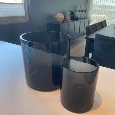 Magnor Glassverk 12 cm vaser laget av grått glass. To vaser med enkel og moderne design fra Halvor Bakke, egnet for dekorasjon i hjemmet eller kontoret.