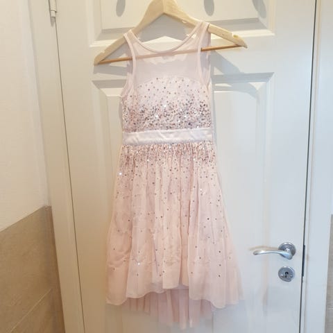 Lindex kjole i størrelse 134 for jente. Kjolen er rød og laget av polyester. Den har volanger foran og dekorative paljetter på skulderstroppene.