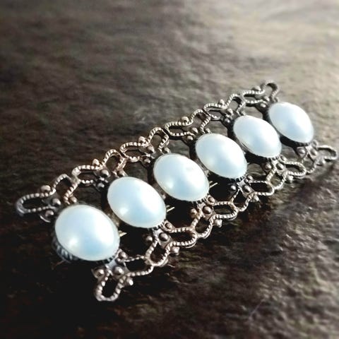 Selger dekorativ vintage brosje i tinn med gjennombrutt, symmetrisk mønster og tydelig håndverksuttrykk